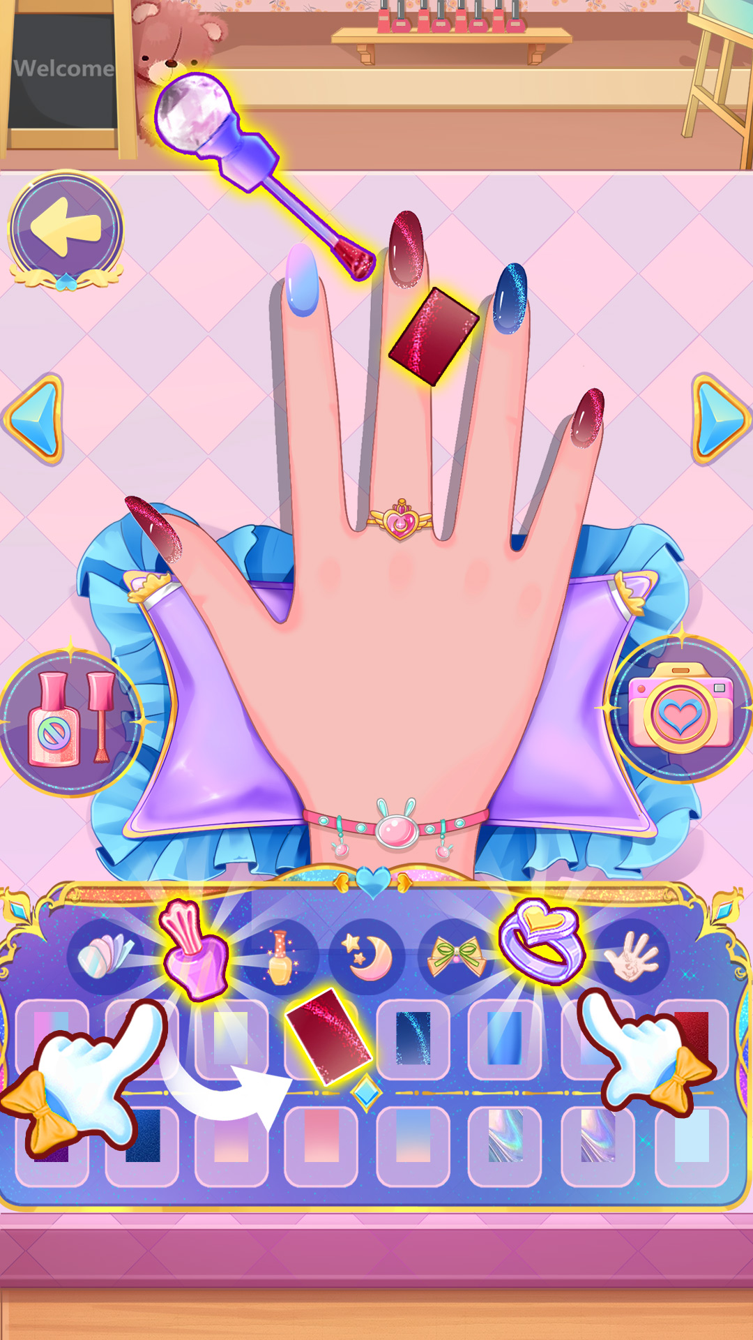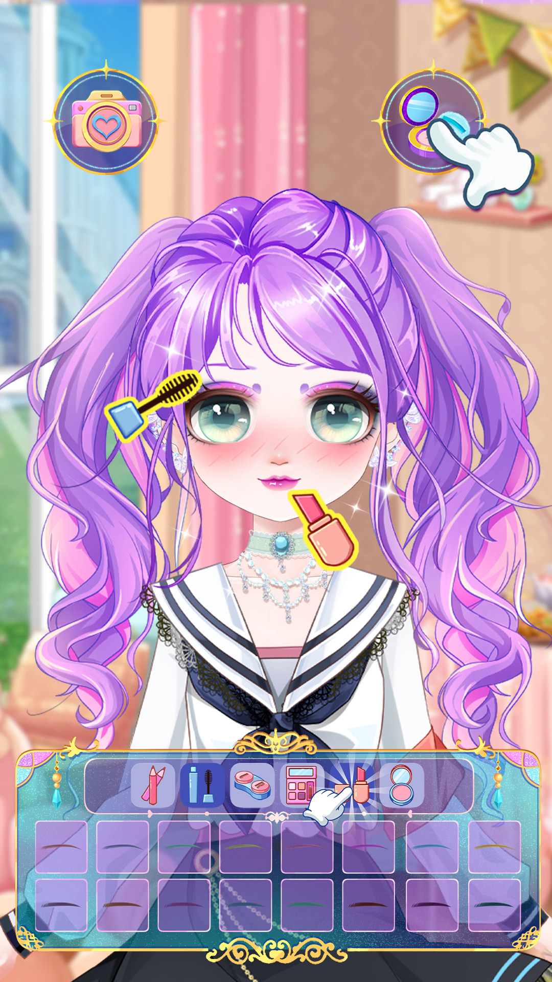 服饰与妆容的丰富度是核心特色,游戏收录上千件冰雪主题单品,从简约的日常针织装、雪地靴,到华丽的水晶礼服、毛绒披风,风格覆盖甜美、优雅、酷飒、魔法等多种类型。妆容系统细分到眉毛、眼影、睫毛、腮红、口红、美瞳等部位,每个部位都有数十种款式,能搭配出清透日常妆、冷艳女王妆、梦幻精灵妆等不同效果。此外还加入了服装设计与美甲玩法,可选择服装版型,自定义颜色、花纹与装饰,也能挑选指甲形状、涂层、贴纸,打造专属造型。关卡设计不重复,每个主题都有独特场景与搭配要求,部分关卡还会触发互动剧情,让换装不再是单纯的搭配,而是融入故事的体验。